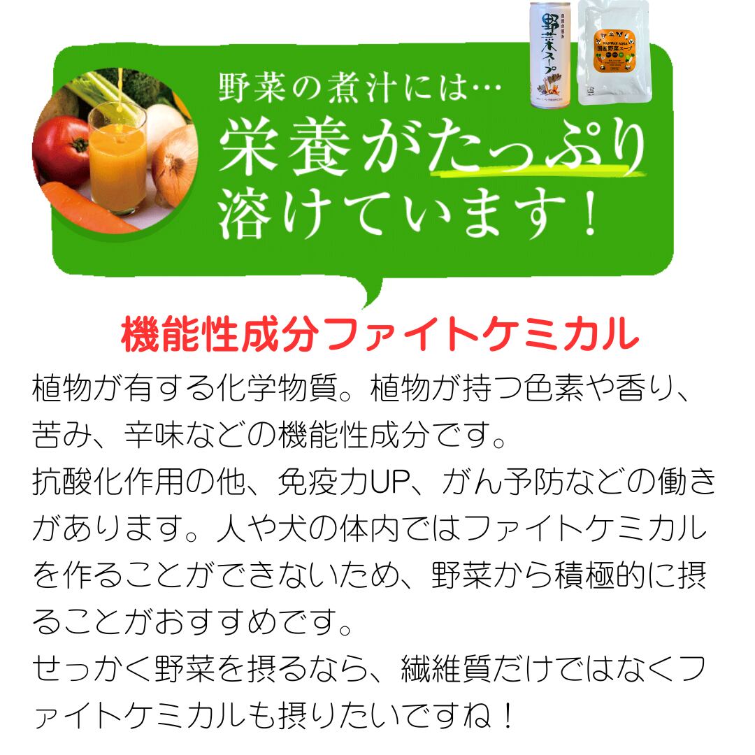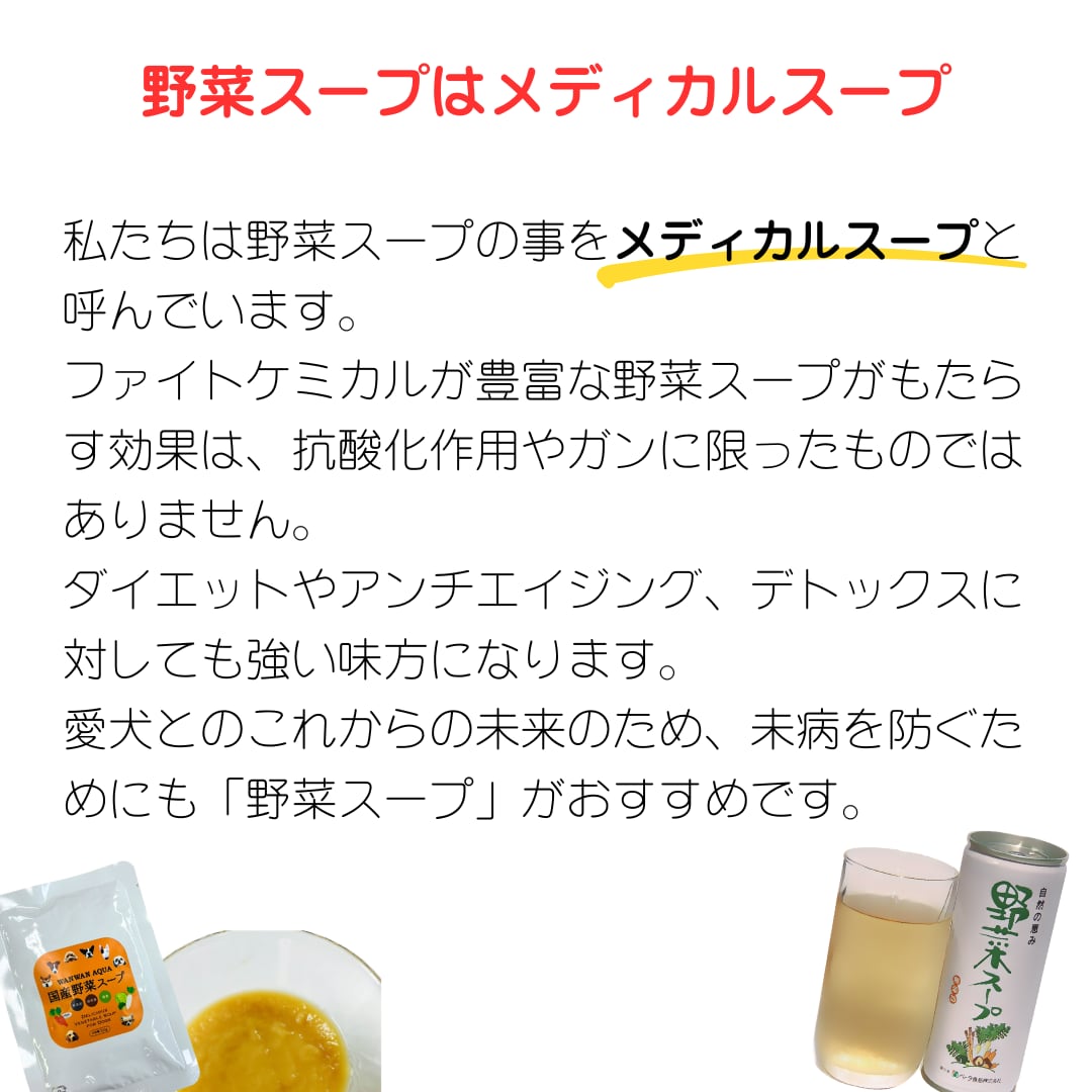 【ヒューマングレード】ぜいたくに国産野菜のみを使用してつくった野菜スープです。ワンちゃんの健康を考え、人参、大根、キャベツ、ブロッコリー、いりごまを煮込んで、まるごとそのままペーストにしました。〈犬用栄養補完食〉として水分補給やフードのトッピングに最適です。フードにトッピング、手作りご飯・防災食・シニア犬のご飯などにご愛用いただいています!ヒト用の食品製造工場で作っているので、安心安全。