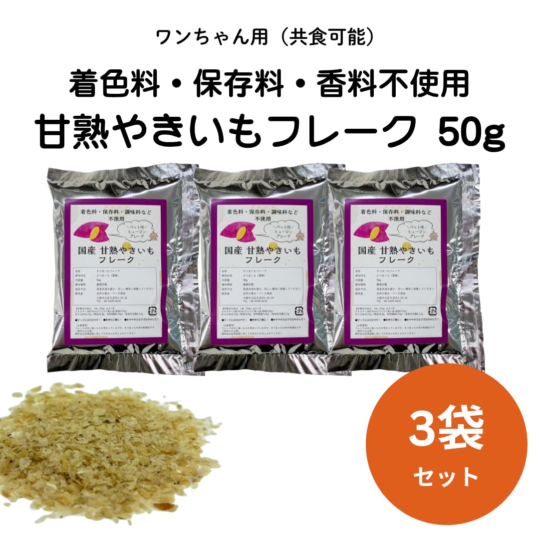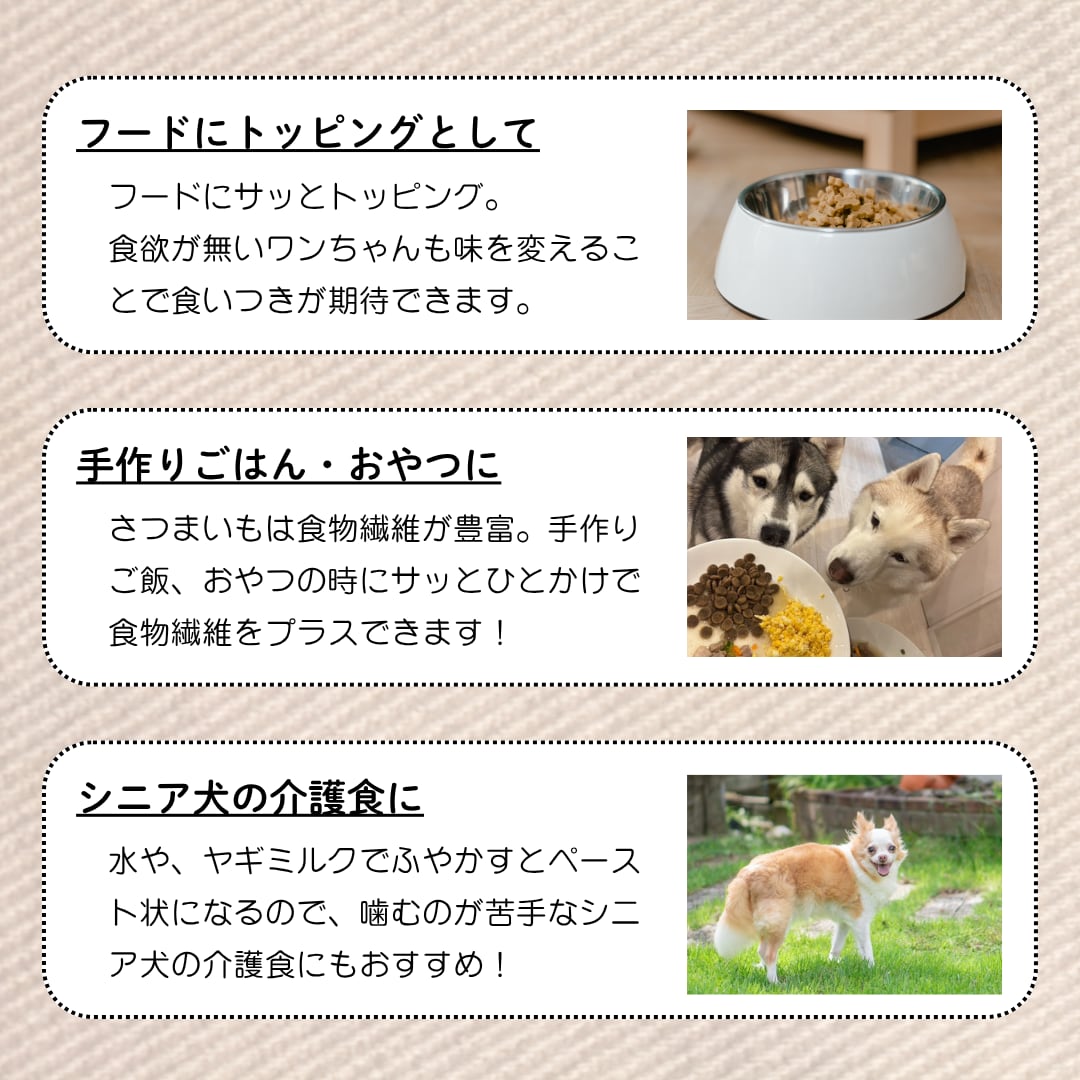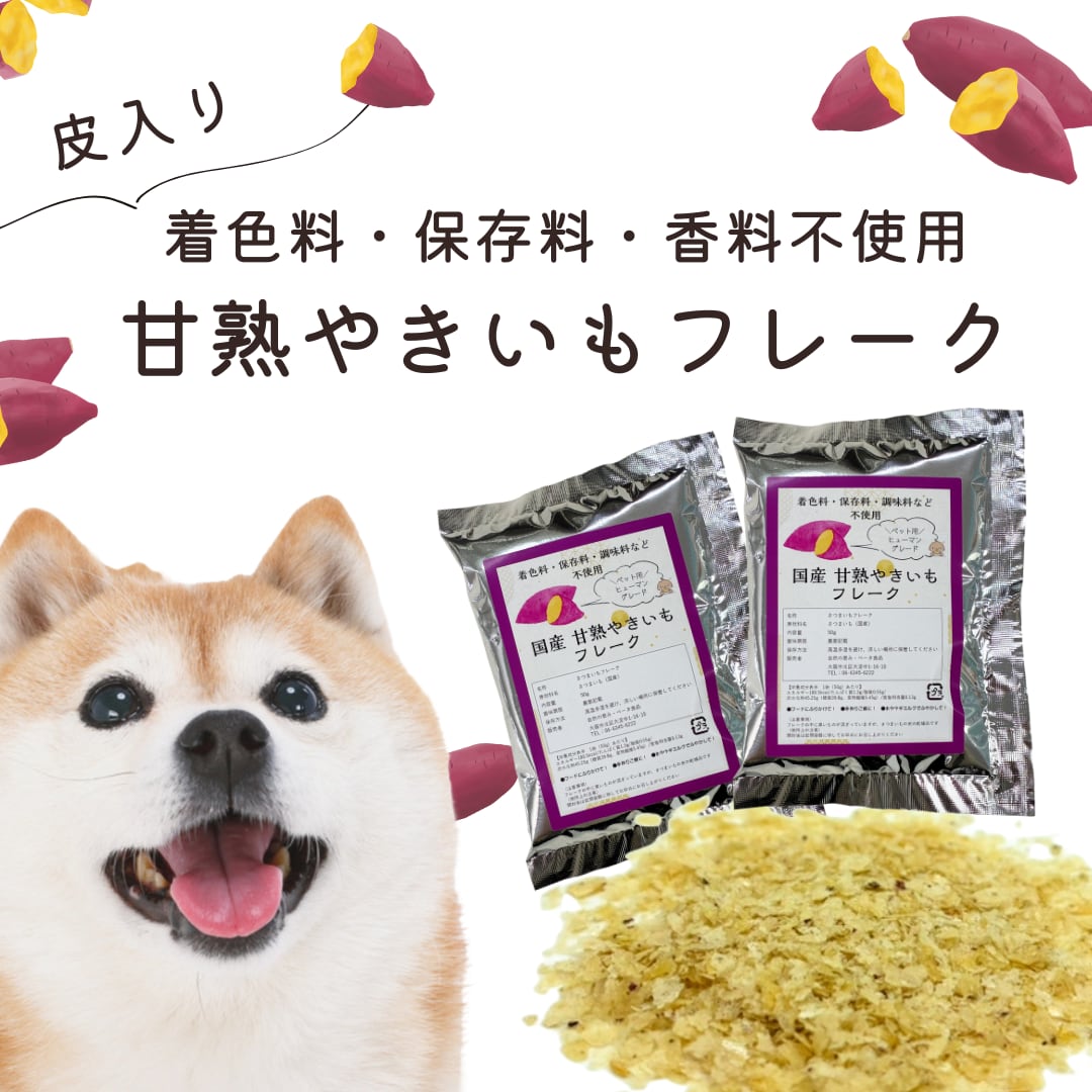 【ヒューマングレード】着色料、保存料、香料不使用。ぜいたくに国産さつまいものみを使用してつくったフレーク(ふりかけ)です。さつまいもの皮入りなので食物繊維も豊富!おなかの調子が気になるワンちゃんにおススメです。フードにトッピング、手作りご飯・ヤギミルクでふやかしてシニア犬のご飯などにご愛用いただいています!ヒト用の食品製造工場で作っているので、安心安全。