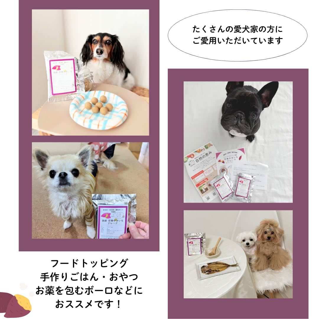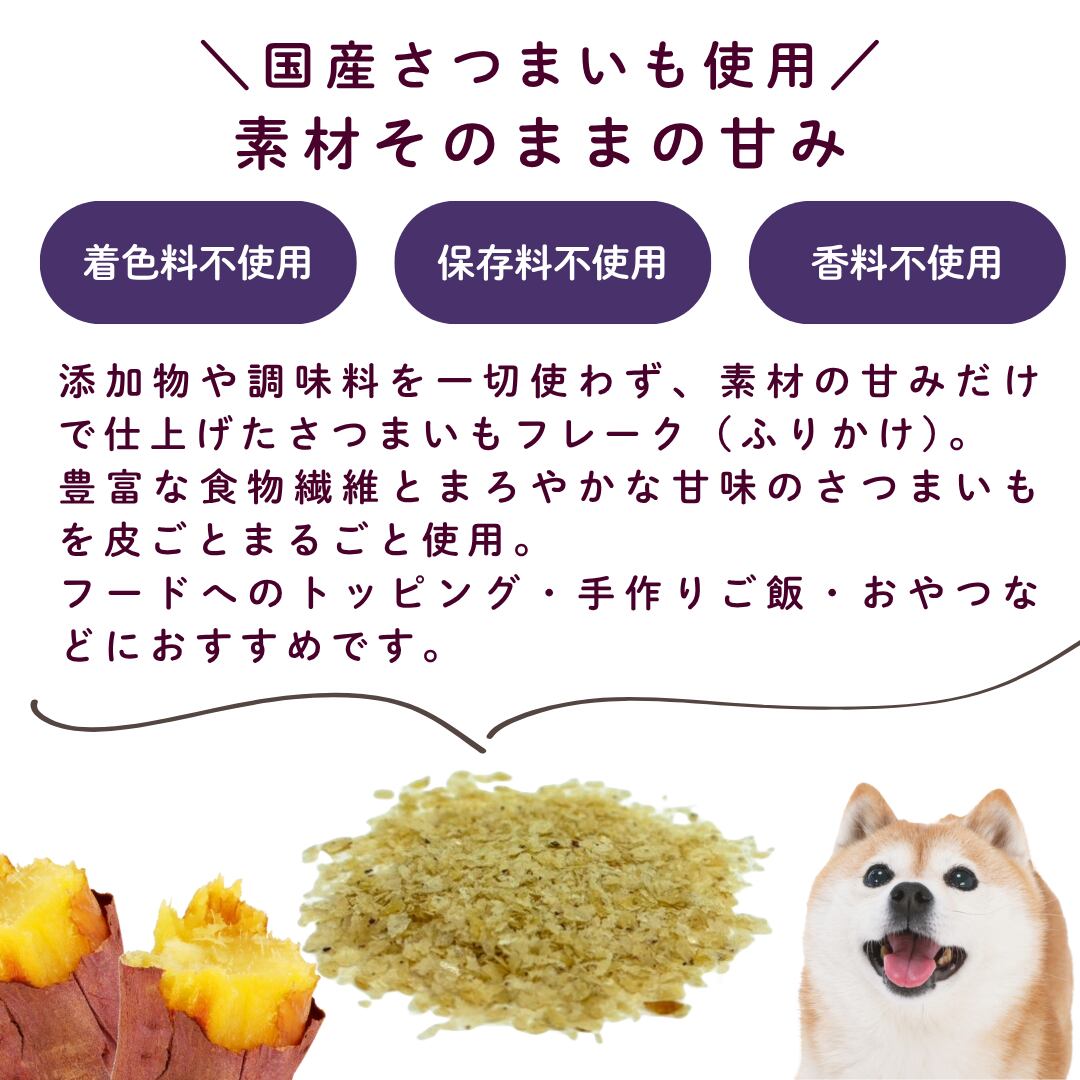 【ヒューマングレード】着色料、保存料、香料不使用。ぜいたくに国産さつまいものみを使用してつくったフレーク(ふりかけ)です。さつまいもの皮入りなので食物繊維も豊富!おなかの調子が気になるワンちゃんにおススメです。フードにトッピング、手作りご飯・ヤギミルクでふやかしてシニア犬のご飯などにご愛用いただいています!ヒト用の食品製造工場で作っているので、安心安全。