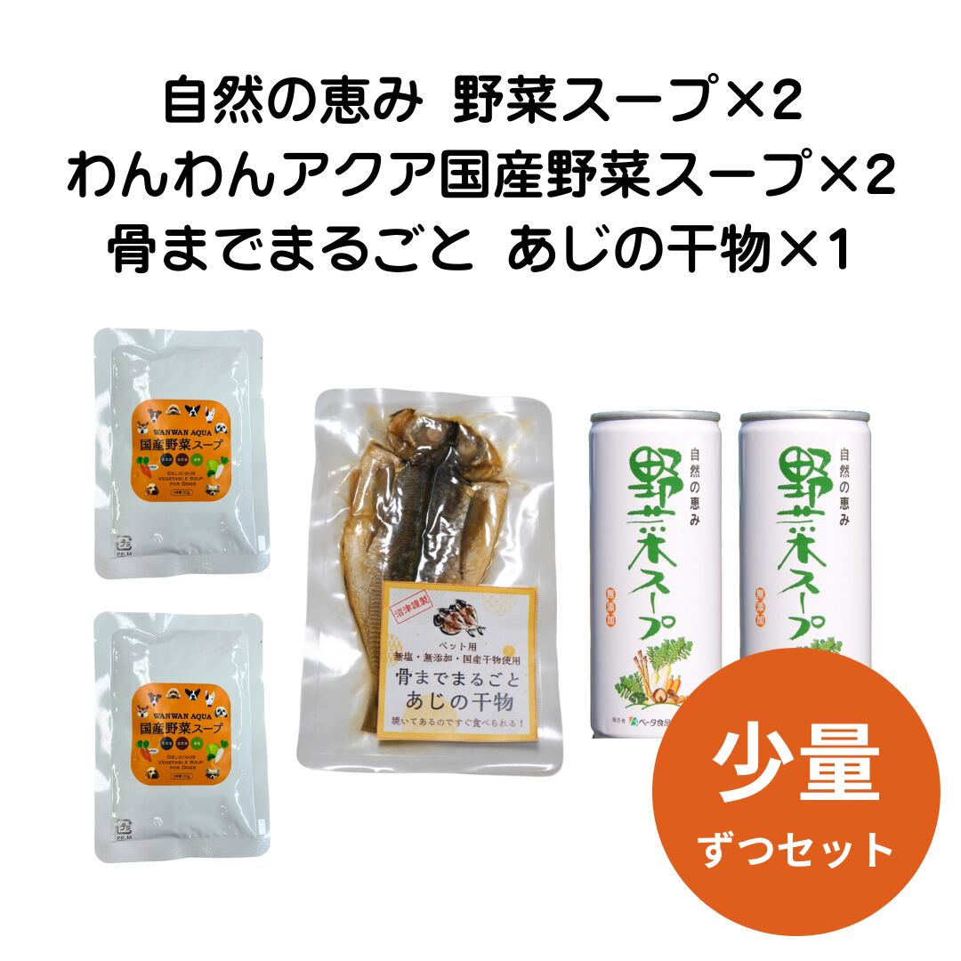 【少量ずつセット】野菜スープ2本、わんわんアクア2袋、骨までまるごとあじの干物1袋 ※送料無料(一部地域除く)